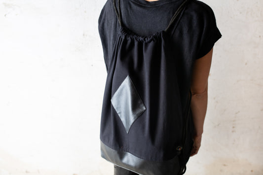 Rucksack - Beutel aus Baumwolle mit Kunstlederelementen - schwarz