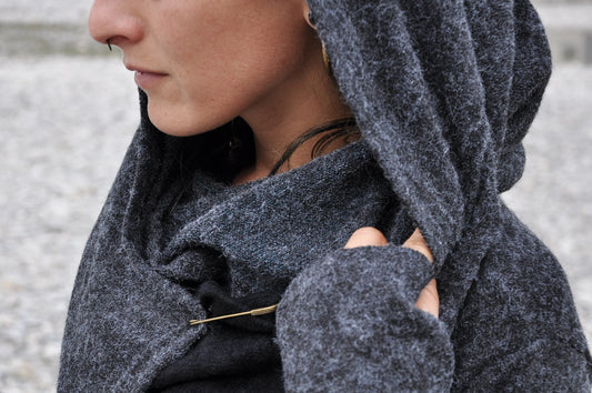 Cardigan zweilagig - Strickjacke, Wickeljacke mit großer Kapuze und Daumenlöchern - grau-schwarz