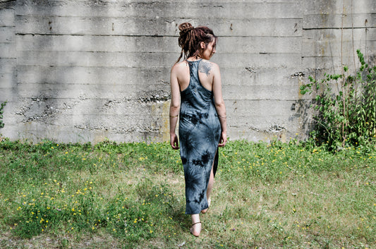Langes Trägerkleid, Maxikleid - mit Racerback und Nieten - Batik, Tie Dye - anthrazit-schwarz