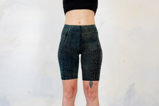 Biker Shorts - with abstract Alligator Pattern - Batik, Screen Printing - blue-green-brown