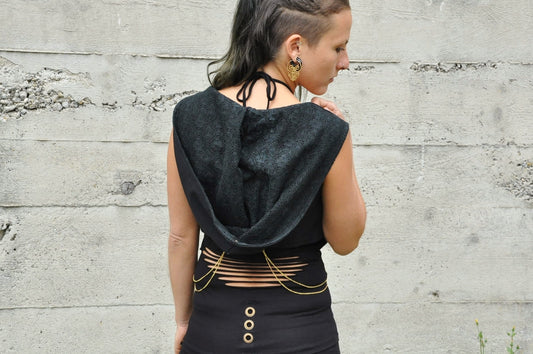 Hooded Vest, Short Vest with Rivets and Brass Chains - black