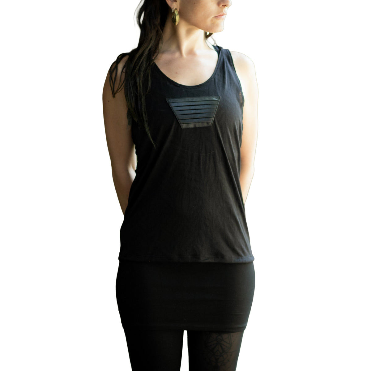 Loose Tank Top - slightly transparent, with artificial leather application - black patterned