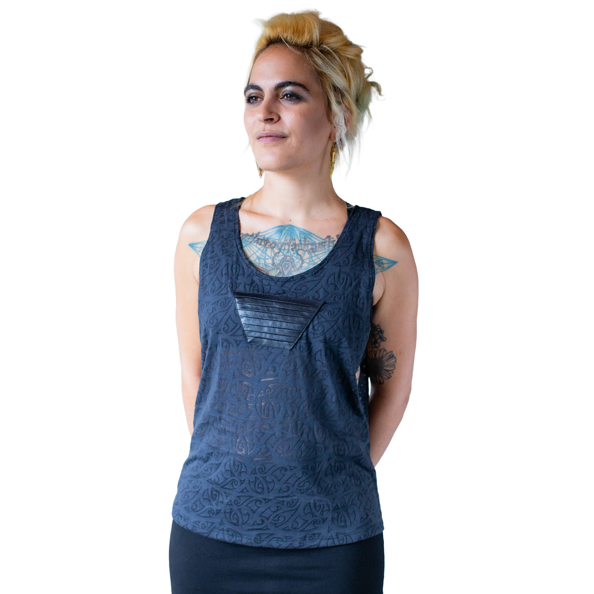 Loose Tank Top - slightly transparent, with artificial leather application - dark blue, petrol patterned