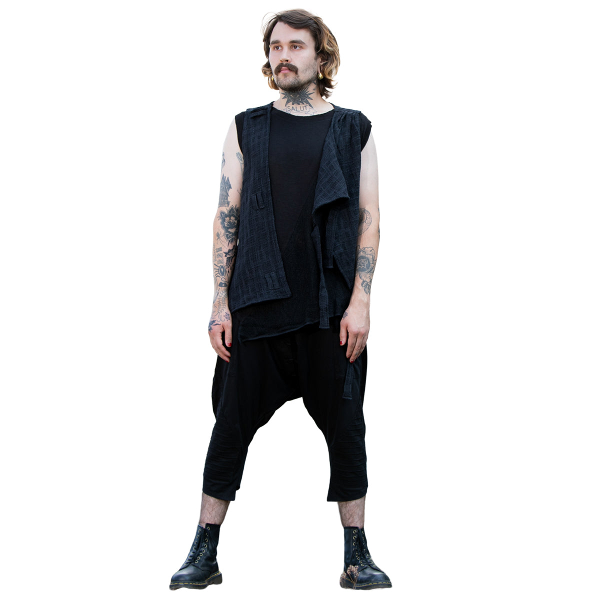 Loose, asymmetrical vest made of structured cotton fabric. There are three tuck-in flaps to close the vest. The vest has a pocket on both sides.