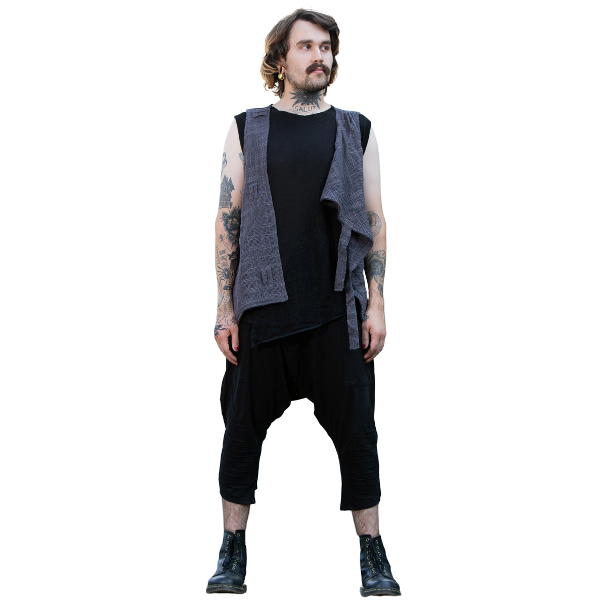 Loose, asymmetrical vest made of structured cotton fabric. There are three tuck-in flaps to close the vest. The vest has a pocket on both sides.