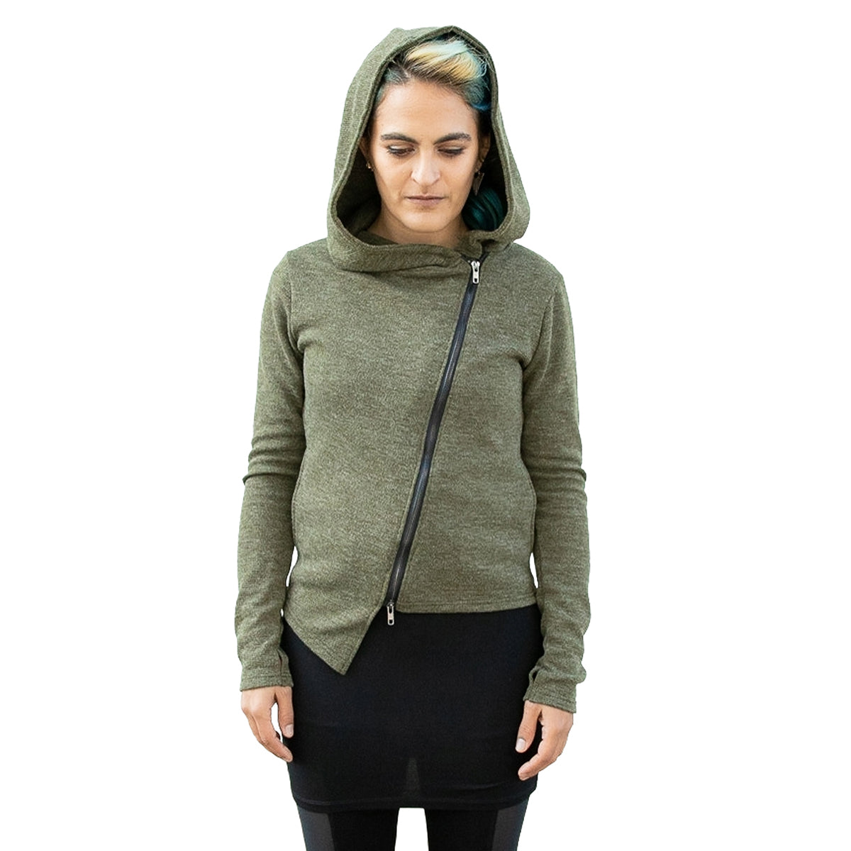 Zipper Jacket with Diagonal Zipper, Thumb Holes and Large Hood - olive green