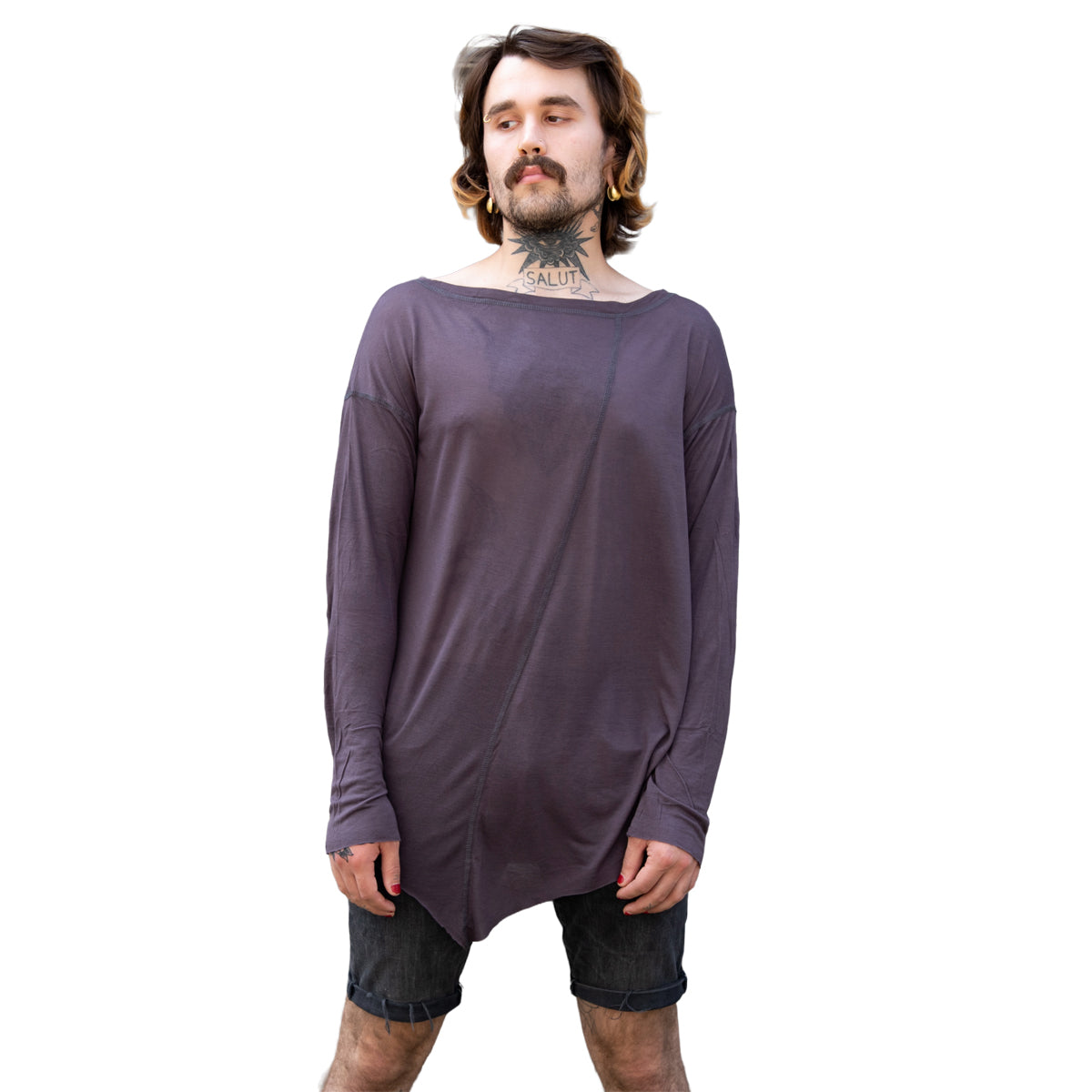 Das Longsleeve ist locker und asymmetrisch geschnitten. Der Stoff ist leicht transparent und fühlt sich angenehm weich an. Sichtbare Nähte geben dem Longsleeve eine besondere Note.