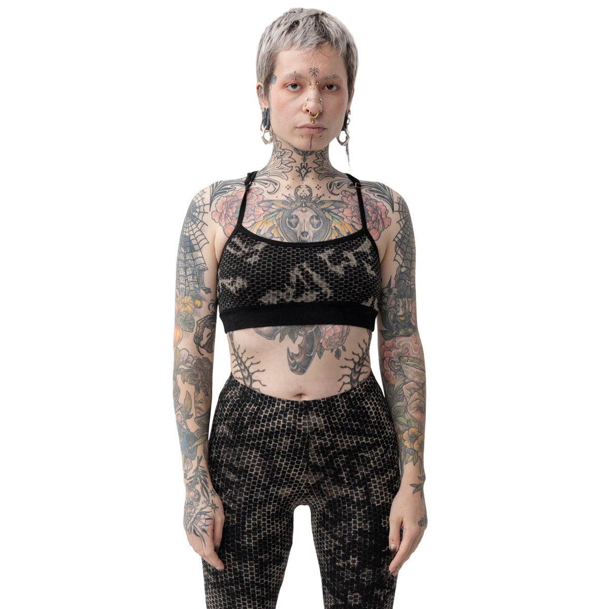 Das Muster des Bustiers entsteht in Kombination aus Batik- und Siebdruck-Verfahren und ist künstlerisch ungleichmäßig angelegt. Die Farben verschwimmen schwarz-grau-beige.