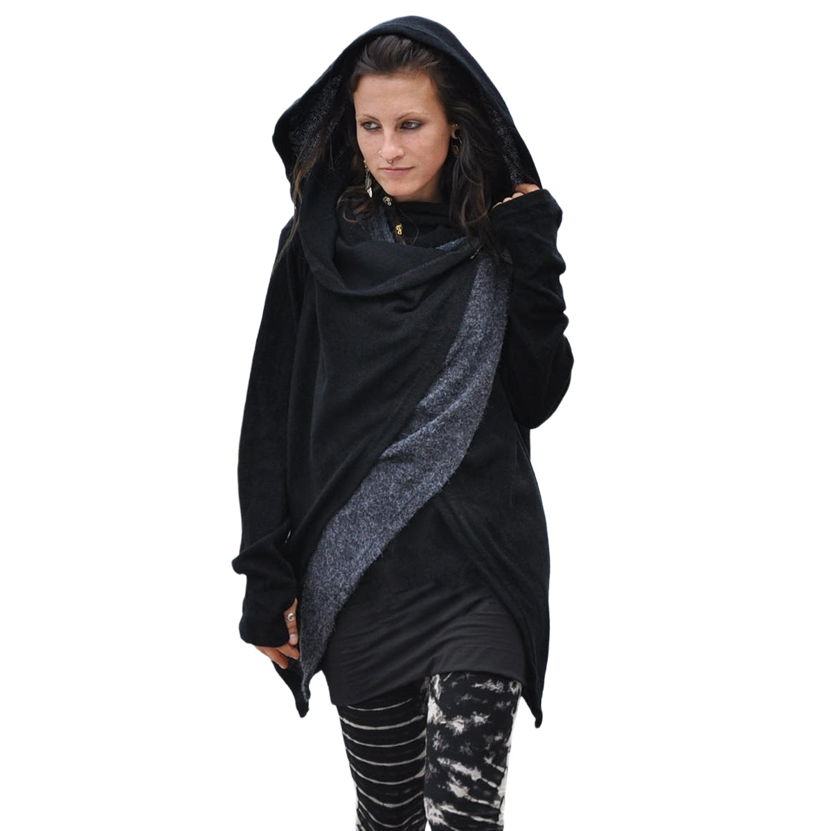 Cardigan zweilagig - Strickjacke, Wickeljacke mit großer Kapuze und Daumenlöchern - schwarz-grau