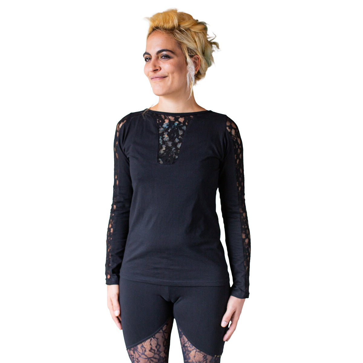 Das Shirt ist an der Vorder- und Rückseite, sowie den Ärmeln mit einer weichen Spitze verziert, welche die Haut durchscheinen lässt. Der Schnitt des Longsleeves ist eng anliegend.