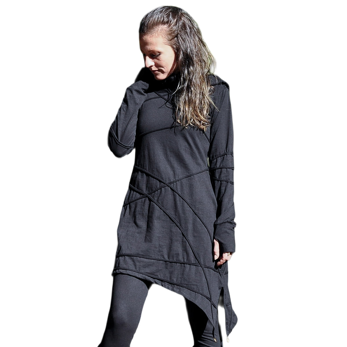 Langärmliges Kapuzenkleid mit Daumenlöchern und extra großer Kapuze.