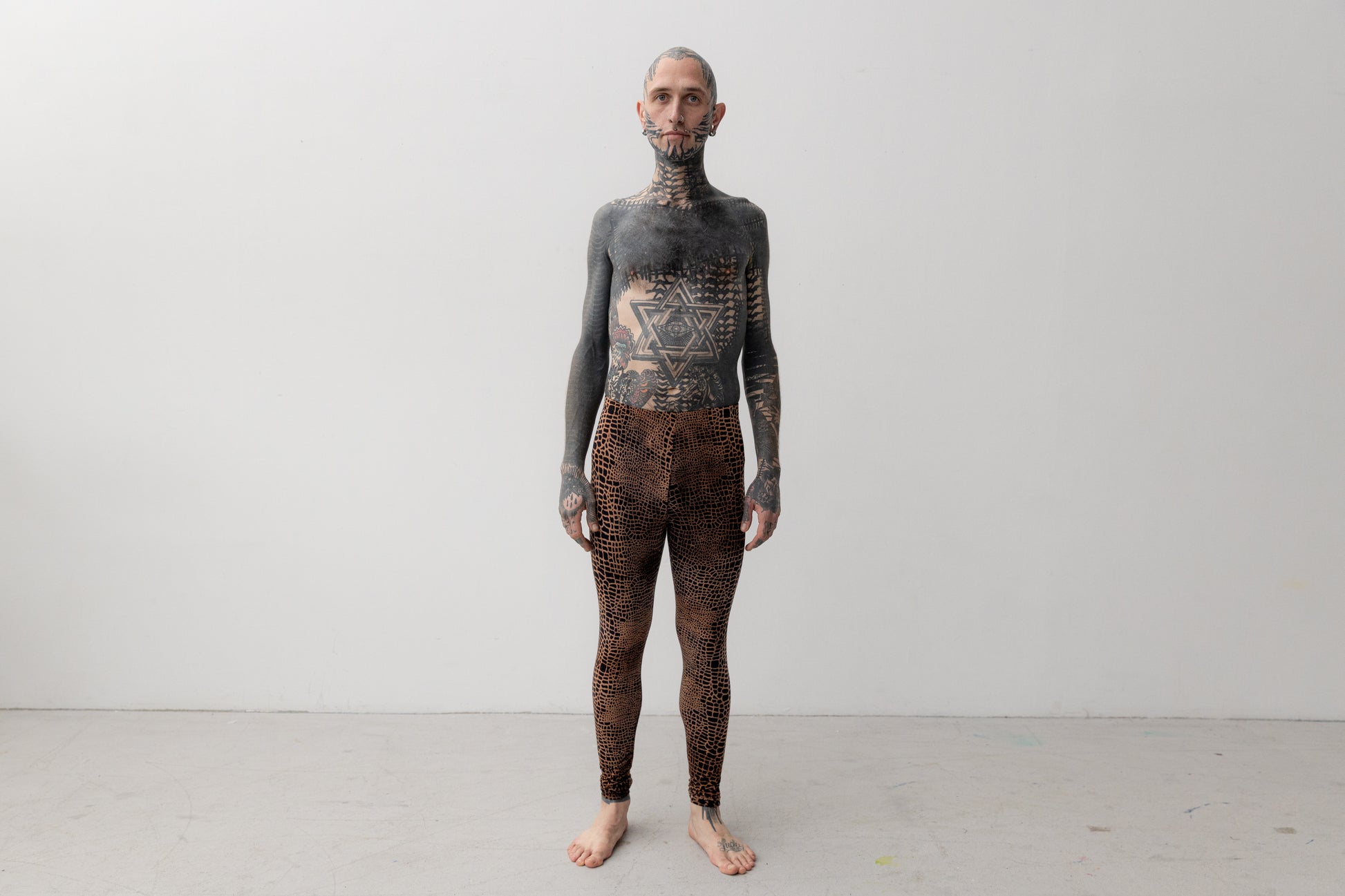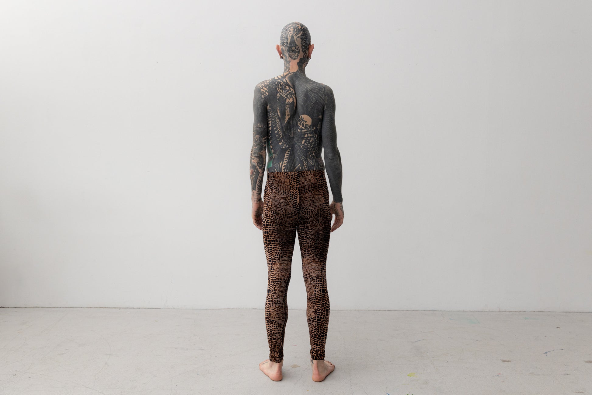 Das Muster der Leggings entsteht in Kombination aus Siebdruck und Batik-Verfahren und ist künstlerisch ungleichmäßig angelegt. Grundfarbe der Leggings ist schwarz. Die Farben verschwimmen rostbraun-apricot von hell nach dunkel.