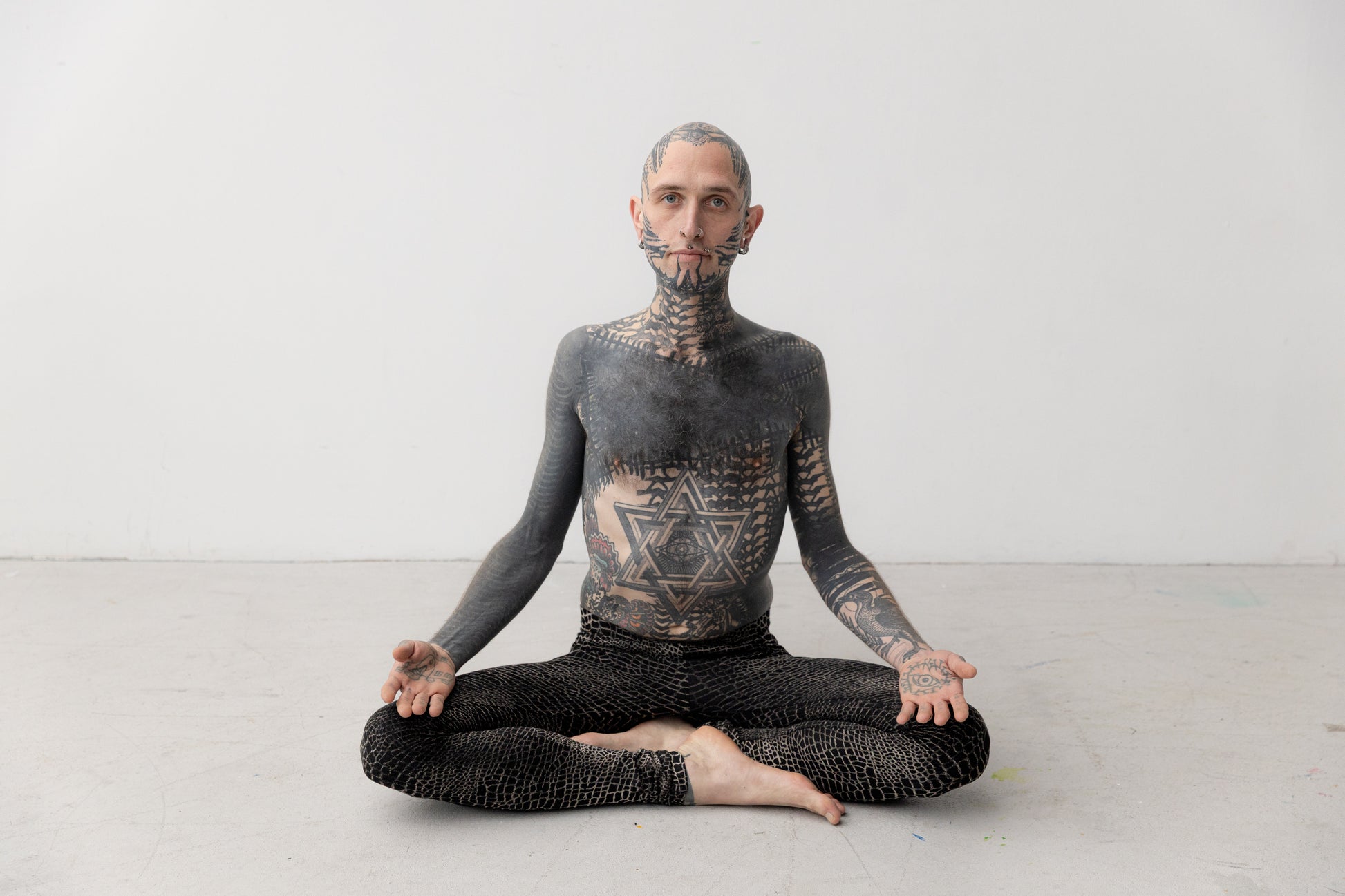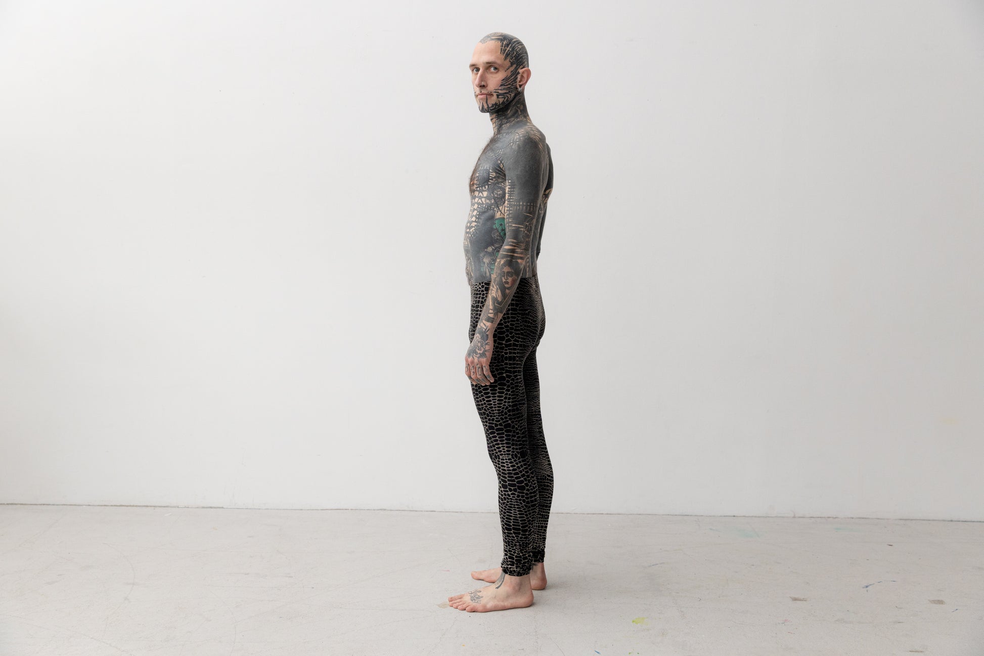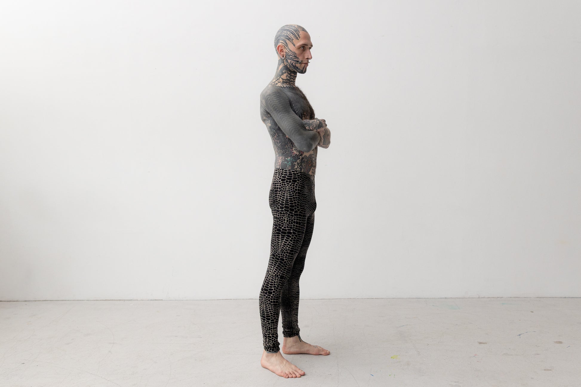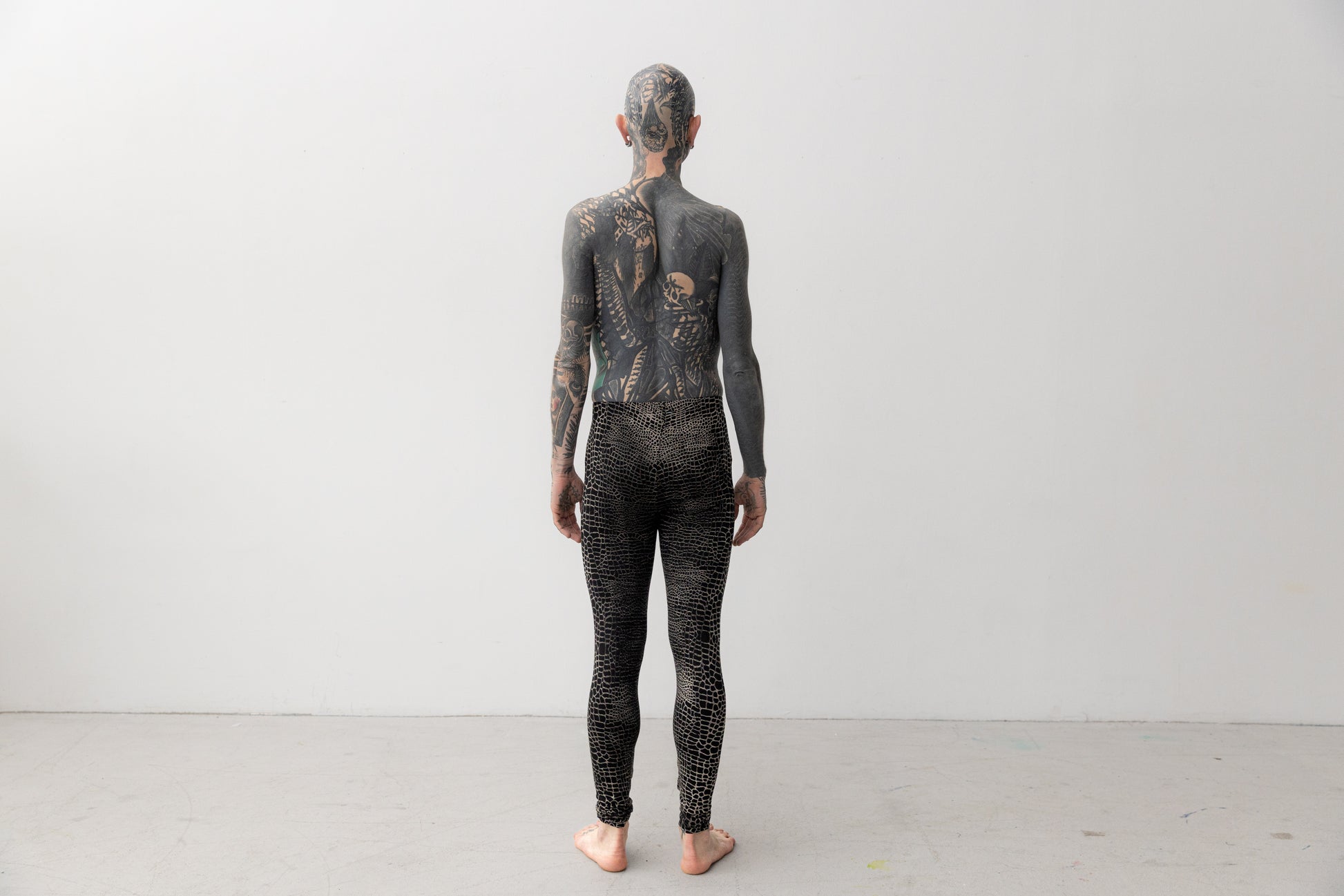 Das Muster der Leggings entsteht in Kombination aus Siebdruck und Batik-Verfahren und ist künstlerisch ungleichmäßig angelegt. Die Farben verschwimmen schwarz-grau-beige von hell nach dunkel.