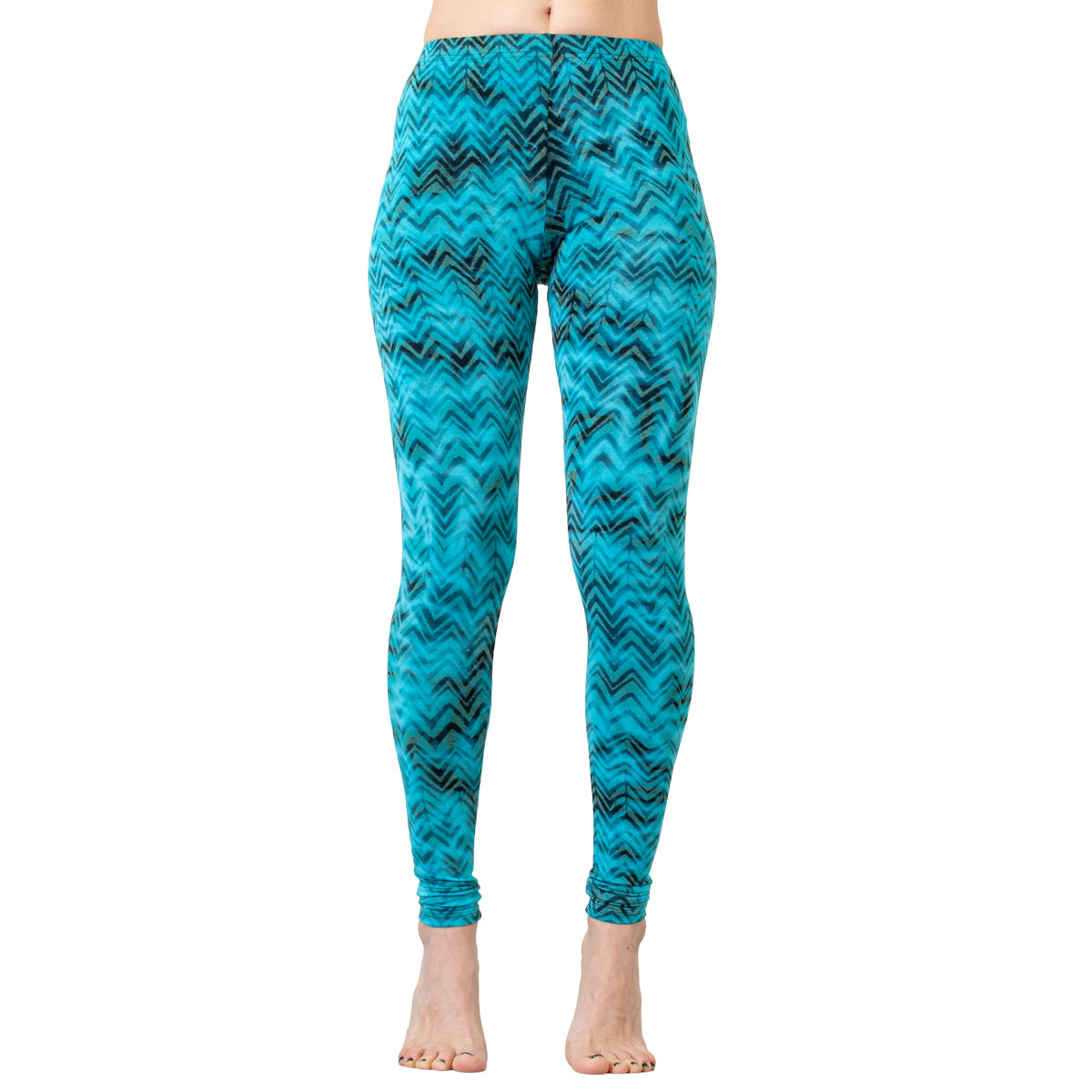 Das Muster der Leggings entsteht in Kombination aus Siebdruck und Batik-Verfahren und ist künstlerisch ungleichmäßig angelegt. Die Farben verschwimmen blau-grün-braun von hell nach dunkel.