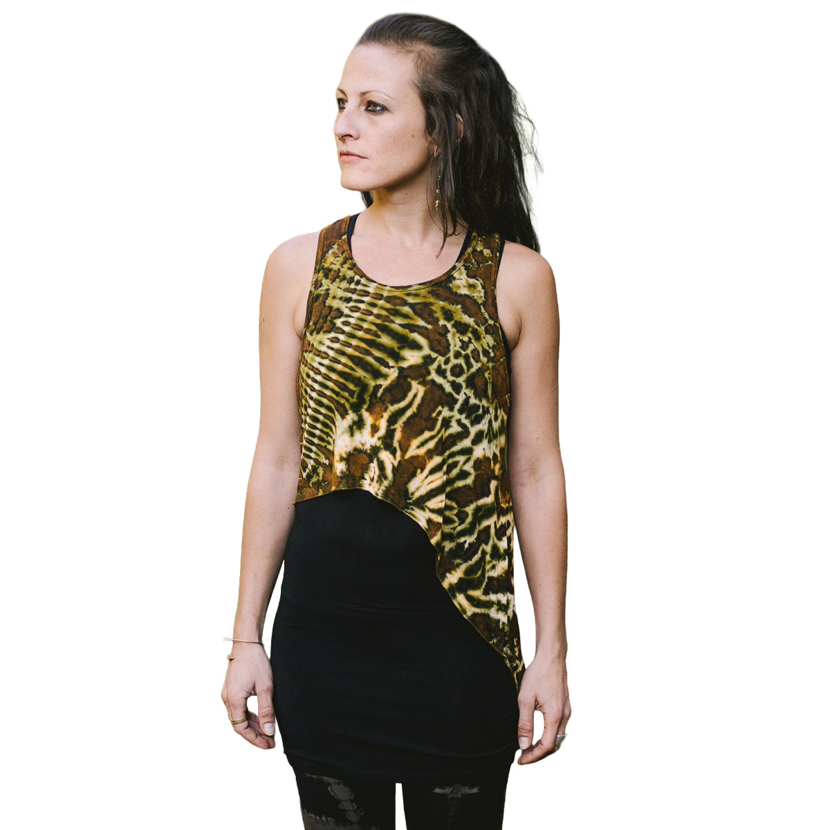 Locker sitzendes Kurztop mit Racerback und Batikmuster.