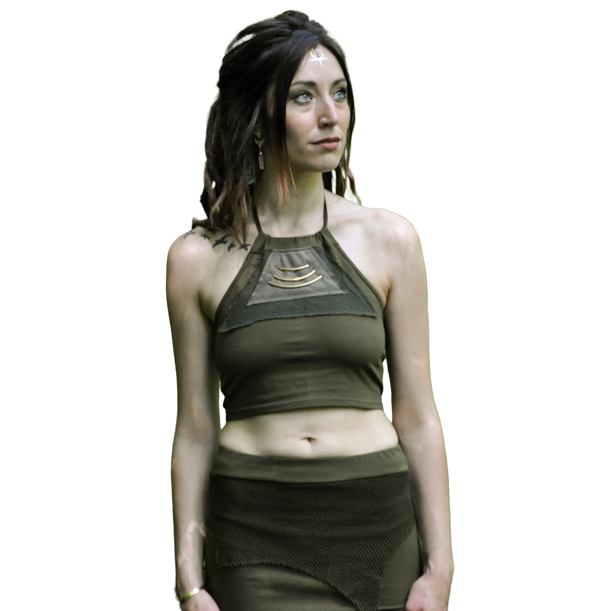 Neckholder Crop Top, Kurztop mit Messingdetails - oliv
