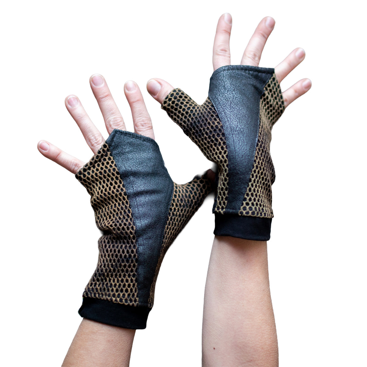 Pulswärmer in Netzoptik - Armstulpen, Handstulpen mit Kunstleder - unisex - schwarz-beige