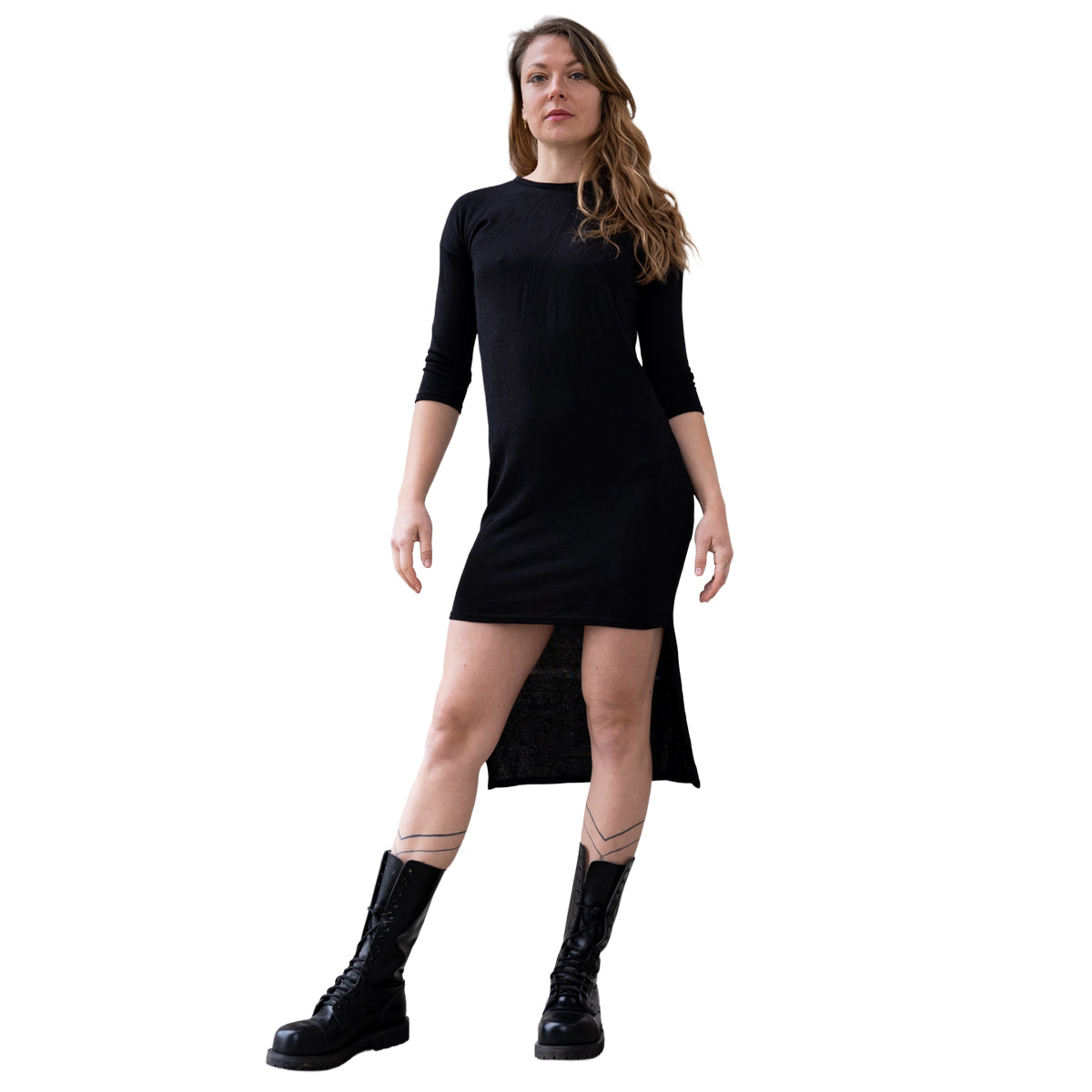 Das Kleid ist locker geschnitten, sowie vorne kurz und hinten lang. Am Rücken hat es einen Reißverschluss. Die Ärmel sind dreiviertel lang.