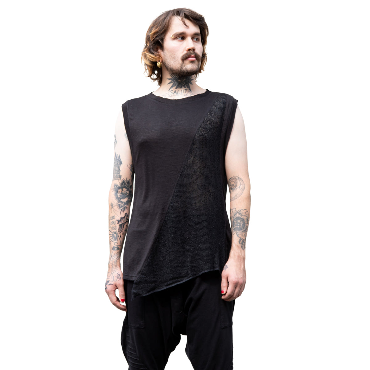 Das Tanktop ist locker und asymmetrisch geschnitten. An der Vorderseite ist ein leicht transparenter Netzstoff eingearbeitet. Messingfarbene Nieten setzen zusätzlich Akzente.