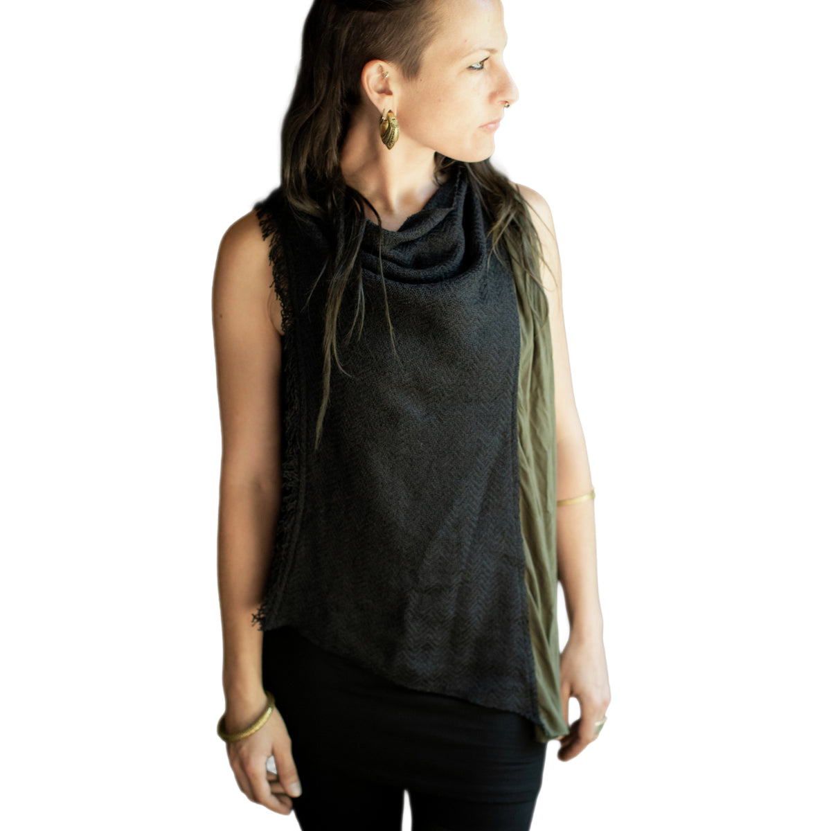Überwurf - Sommer Poncho - mit Wasserfall-Ausschnitt und Häkel-Optik - schwarz-olivgrün