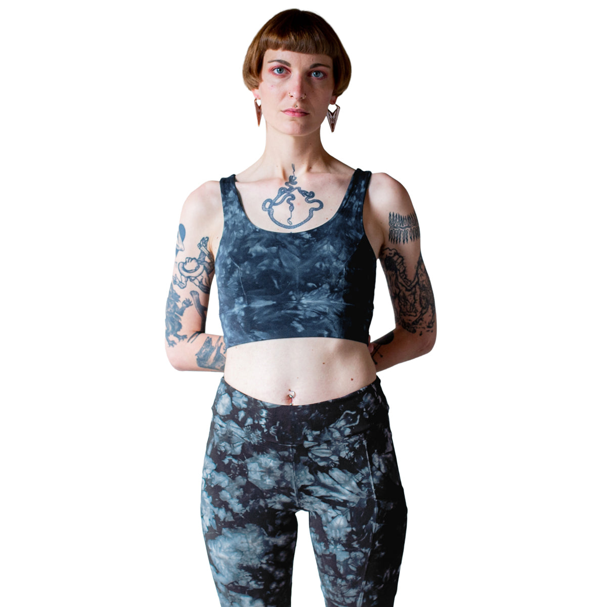 Das Muster des Bra Tops entsteht im Batik-Verfahren und ist künstlerisch ungleichmäßig angelegt. Die Farben verschwimmen dunkelblau-blau.